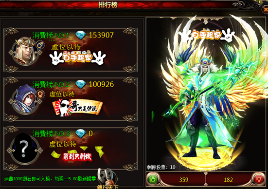 女神累計消費1000鑽石,當下沒有人消費比她高,她就能獲得消費排行榜第一名的稱號『白手起家』,若男神這時累計消費到1001鑽石,就能獲得消費排行榜第一名,搶走女神的暫時稱號『白手起家』與加成屬性。這時女神就暫居第二,可獲得第二名的稱號,以此類推。