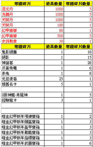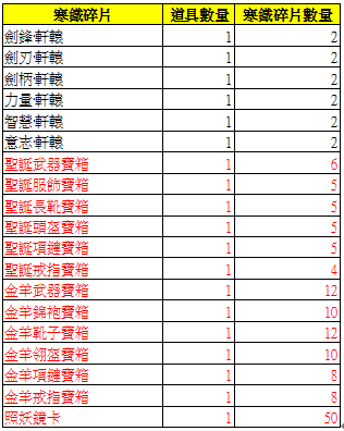 【活動內容】:使用寒鐵碎片,殘舊的名卡可於神器祭壇兌換以下的獎勵。