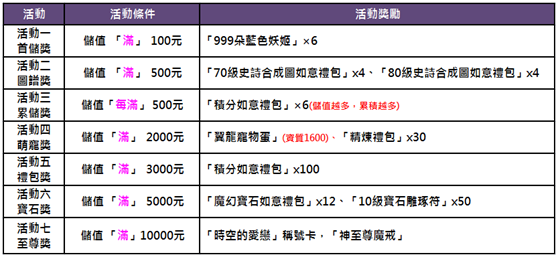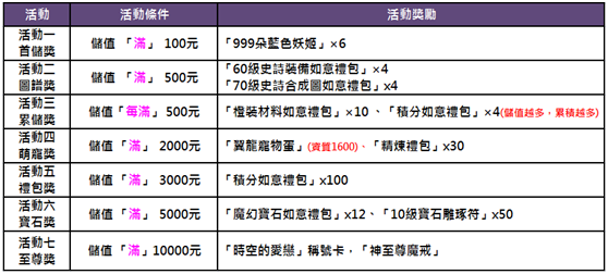 活動期間內,單日累積儲值金額達以下條件,即可獲得符合資格的所有獎勵。