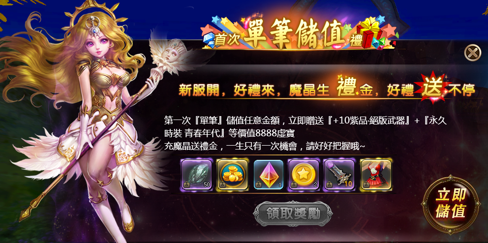 活動說明:第一次「單筆」儲值任意金額,除送「初級強化石」、「魂源」、「金幣」外,再送「+10紫品絕版武器」+「永久時裝 青春年代」以及等值禮金給你
