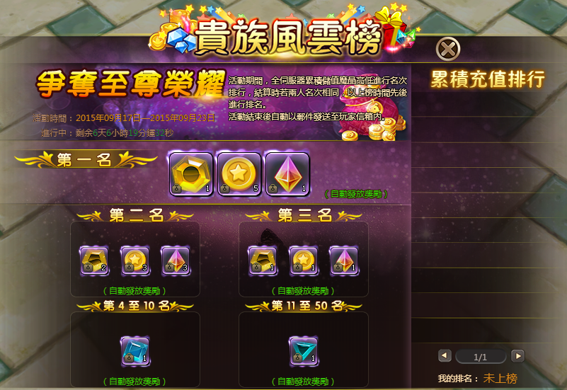 - 系統將會活動結束時自動發送各名次獎勵至前50名玩家的信箱中