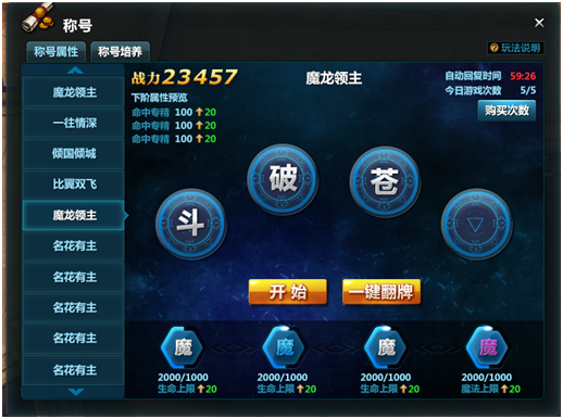 玩家翻轉卡牌將翻扣著的卡牌從背面翻到正面,每翻轉一次,卡牌上的能量會隨機飛入稱號其中的一個字進行培養,當培養經驗滿,即可獲得屬性。