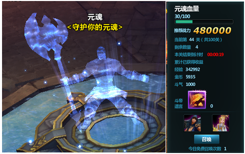 玩家可在當前關卡召喚蕭炎或薰兒(二選一)助戰,進入新關卡後會自動離開。玩家每天有1次免費召喚的次數。