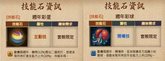 球場也可獲得技能石囉!現正舉辦機率掉落「技能石」活動,讓所有玩家可以快速替換技能提昇武將價值,全州郡球場都有機會掉落週年慶限定技能石哦!若攻打球場成功則有機率獲得限定技能石,除了週年彩蛋、週年彩球,也有機會獲得其它技能石,且當日攻打越多次球場則獲得技能石的機率也會進而提升哦!