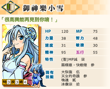 「御神樂小雪」和「小雪」相較之下速度較優,但其他數值就稍微低一些。能裝備的物品和種族特徴、絆結時的數值+額外加成點數的合算値和「小雪」相同。
