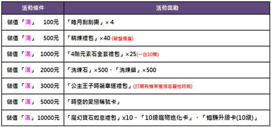 活動期間內,單日累積儲值金額達以下區間,即可獲得該區及以下的獎勵。