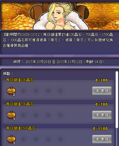 維修後至11/12,每日或累計充值達指定金額可以獲得道具「南瓜」
