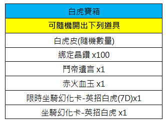 2.【白虎皮】與【白虎皮】僅限本期活動中使用,逾期不另開放兌換唷。