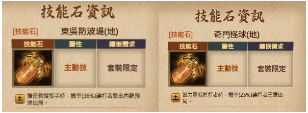 球場也可獲得技能石囉!現正舉辦機率掉落「技能石」活動,讓所有玩家可以快速替換技能提昇武將價值,益州球場有機會掉落東吳防波提技能石、而交州球場則有機率獲得奇門怪球技能石!除了東吳防波提、奇門怪球,也有機會獲得其它技能石,且當日攻打越多次球場則獲得技能石的機率也會進而提升哦!