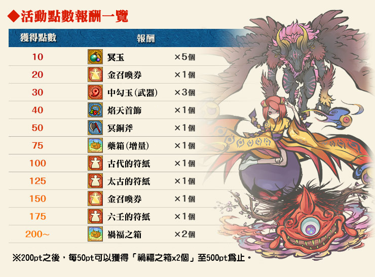 打倒指定妖怪就能獲得「活動點數」,以下為討伐指定妖怪時能獲得的活動點數及推薦等級: