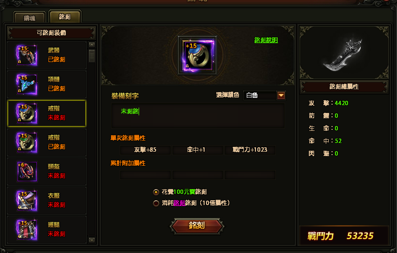* 消耗100元寶或者銘刻道具可對裝備進行銘刻,玩家可隨意選擇想輸入的文字及顏色。