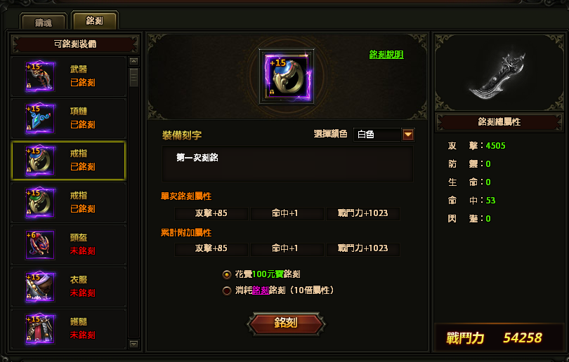 * 使用刻銘道具獲得的屬性,將會是使用元寶刻銘的10倍屬性。