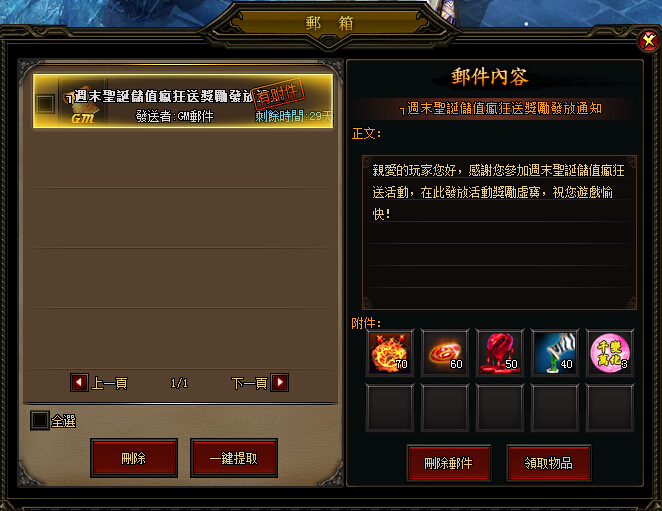親愛的玩家您好 週末聖誕儲值瘋狂送活動於12月25日00:00 ~ 12月27日 23:59單筆儲值超過350點以上的玩家,目前獎勵已發放完畢,得獎玩家已可於遊戲內郵箱領取活動獎勵,若於郵箱中未出現獎勵信件,請重新整理網頁即可。《九星天辰訣》營運團隊敬上
