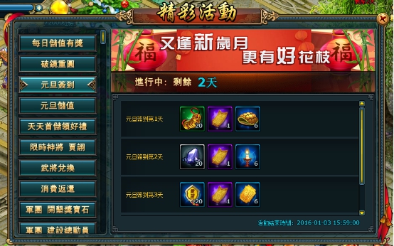 | 1月2日 | 聲望卡×20、銀票*1、日常刷新令×6 |