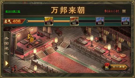 活動內容: 活動期間,玩家通過發起請柬獲得不同國家的進貢來獲得不同數量的絲綢、西域錦囊和招商令,以及提升一定的名氣,當名氣達到指定值時,獲得名氣稱號。