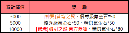 活動內容:活動期間內,累計儲值滿額,即可獲得豐富獎勵!