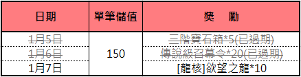 活動內容:活動期間內,單筆儲值NT.150即可獲得以下獎勵一份!