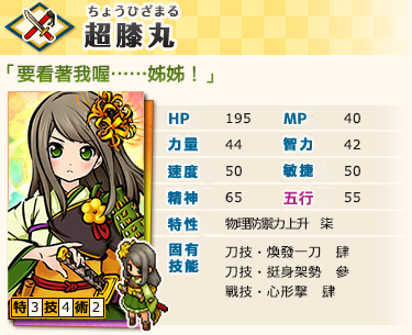 ※「超膝丸」的基本數值、可裝備品、加乘點數、特/技/術欄位都和一般的膝丸相同。。