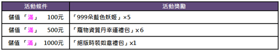 範例:小飛鼠於01/17(日)儲值3000元,即可獲得「999朵藍色妖姬」x5、「寵物資質丹幸運禮包」x6、「奇幻寶石如意禮包」x5、「時尚如意禮包」、「靈魂點」x500,000、「聲望」x1,350,000 、「絕版時裝如意禮包」。