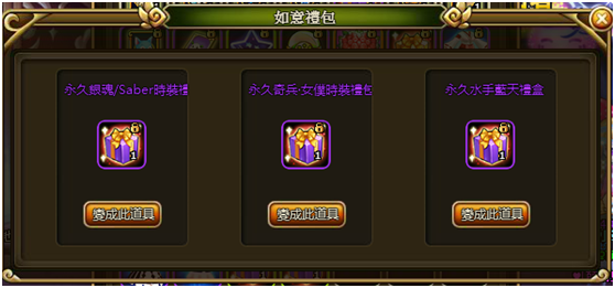 1.絕版時裝如意禮包:開起可選擇其中一套時裝「銀魂/Saber」、「水手時裝」、「生化奇兵/女僕」。