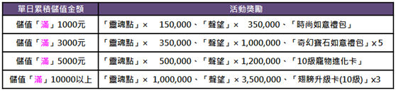 活動期間內,單日累積儲值金額達以下條件,即可獲得符合資格的區間獎勵。