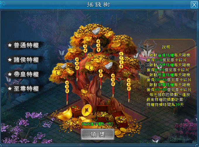 | 諸侯特權 | 隨機8~20個至尊卡碎片 |