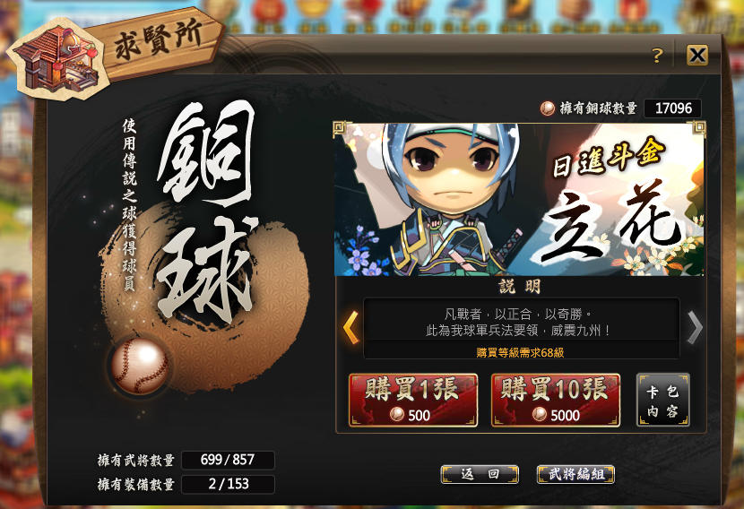 高等玩家還能選擇「智變千慮陸遜包」、「西涼驃騎馬超包」還有最新上架的「日進斗金立花包」、「兵強馬騰黑田包」等等,讓你拿到稀有武將機率大提升!