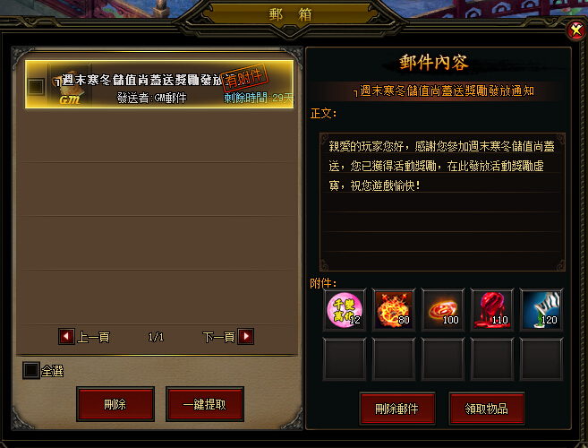 親愛的玩家您好 週末聖誕儲值瘋狂送活動於01月29日00:00 ~ 01月31日 23:59舉辦完畢。 在活動期間內單筆儲值300點以上即可獲得虛寶好禮。 目前獎勵已發放完畢,得獎玩家已可於遊戲內郵箱領取活動獎勵,若於郵箱中未出現獎勵信件,請重新整理網頁即可。 獎勵領取信件 《九星天辰訣》營運團隊敬上