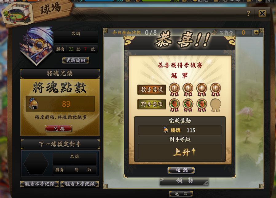 玩家可在「名將聯賽」中挑戰知名戰役,當難度越高獲得的將魂就越高,將魂可兌換各種獎勵。
