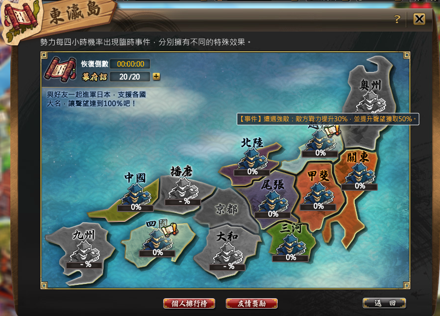 活動期間每次事件刷新必有3個事件,並為以下事件二取一:【事件一】大名犒軍:本軍聲望獲取提升30%。【事件二】遭遇強敵:敵方戰力提升30%,並提升聲望獲取50%。 提升聲望趁現在哦!