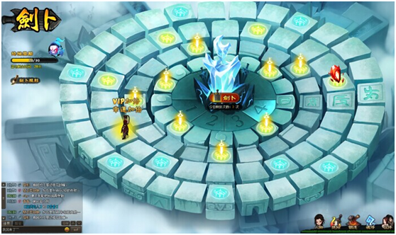 活動期間玩家每天可劍僕兩次,每次劍卜可在劍陣上前進1~4步,劍陣上有豐富的銅錢、禮券和各種道具的獎勵,玩家達到對應格子即可領取,還有機會觸發幸運獎勵!
