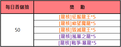 活動內容:活動期間內,每日首儲NT.50,即可隨機獲得一項獎勵!