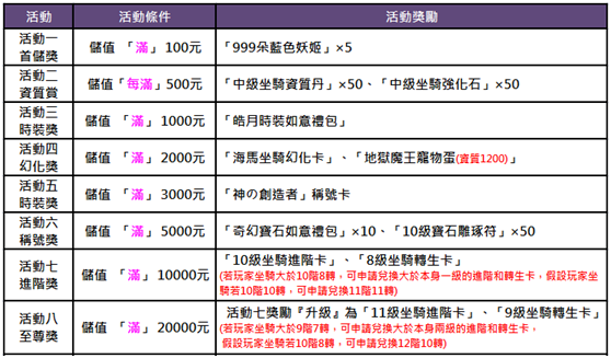 活動期間內,單日儲值累積金額達以下條件,可獲得符合資格的獎勵: