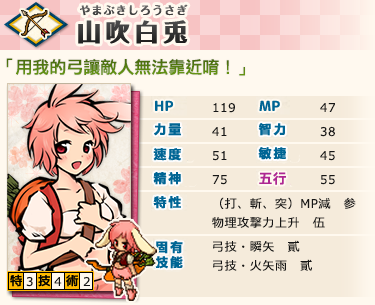 ※「山吹白兔」和一般的白兔有所差異,除了數值相當於稀有式姬,並具有兩項特性之外,技和術的欄位、還有固有技能也不相同。