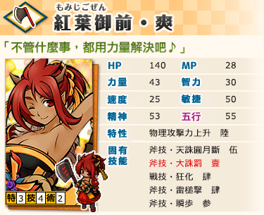 ※「紅葉御前・爽」的種族特徵及結緣後的能力值適用於一般系統。