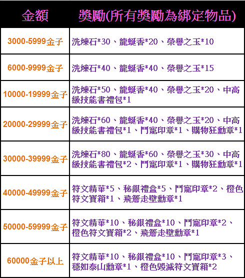 活動內容:玩家只要累計消費到指定金額的金子,將可以額外獲得獎勵。(所有獎勵為綁定物品)