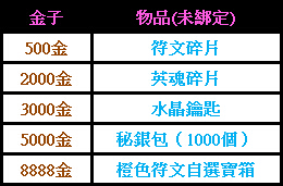 活動內容:玩家只要一次性兌換一定金子即可得到相應禮品(皆為未綁定物品):