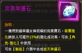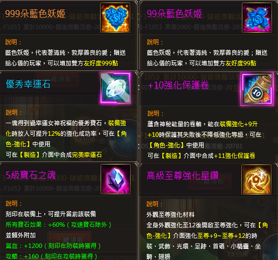| 10,000 | 高級強化星鑽*10、999朵藍色妖姬*5、+10強化保護卷*2、8級寶石之魂*2 |