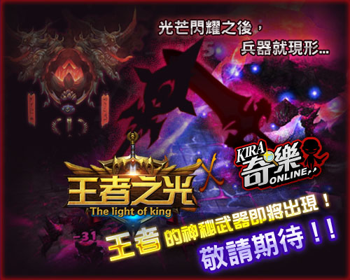 「歡樂派」旗下最新遊戲《王者之光》全面啟動囉!為了與各位奇樂迷分享遊戲體驗,即日開始《奇樂》與《王者之光》攜手合辦第三十彈「王者專屬的神兵!」活動!只要《奇樂Online》玩家到《王者之光》達成目標任務即可獲得造型好禮喔!