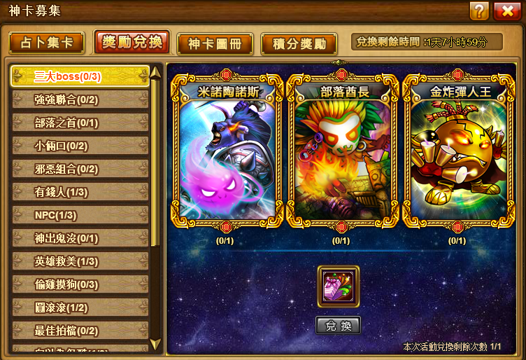 Ø 占卜獲得卡牌,可用於兌換卡牌組合獎勵,集齊指定的卡牌種類和顏色,即可兌換相應禮包,同是,每種組合的兌換次數是有限制的哦