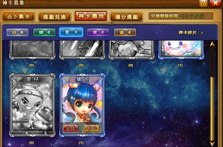 Ø 在“神卡圖冊”頁面,卡牌可進行“粉碎”和“合成”操作,“粉碎”即卡牌粉碎成神卡碎片,相應數量的神卡碎片可“合成”對應顏色的神卡,獲得的神卡碎片在“神卡圖冊”頁面可查看。