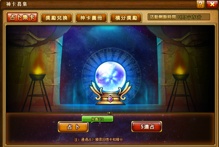 Ø 點擊“占卜”按鈕即可進行占卜。占卜一次可隨機獲得一張卡牌,同時還能獲得200積分,卡牌可用於兌換組合獎勵,積分可用於兌換積分獎勵;活動時間內,每日可免費占卜3次