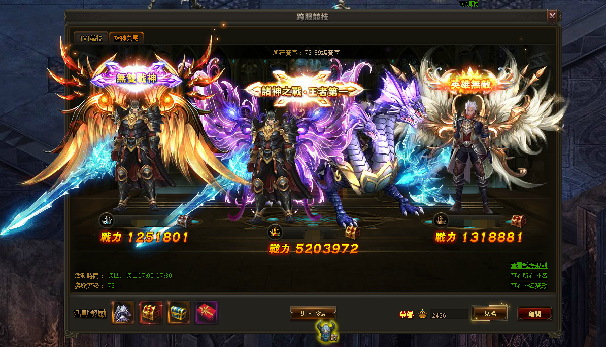 點擊 [諸神之戰] 進入報名頁面,報名後將傳送到 [備戰區]