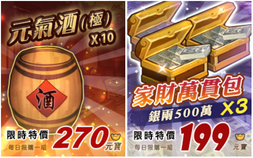 官方將於週末推出市集特賣,只要270元寶就可購入元氣酒(極)x10、199元寶就可購入家財萬貫包,讓所有君主都能買到賺到,市集限時特價,每人每日限購1組!