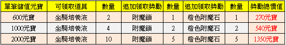 、活動時間 2016/10/13(四)00:00-2016/10/19(三)24:00 二、活動對象 全伺服器所有玩家 三、活動內容 活動期間,單筆儲值金額滿足以下條件即可獲得對應之獎勵,重複儲值可以再次領取獎勵! 四、注意事項 如因情事變更,導致活動須取消、終止或修改,本公司將另行公布於官方網站中。