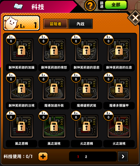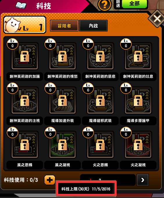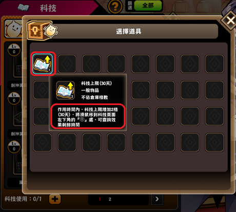 1.科技上限(1天)道具使用後,科技開啟欄位增加2格,效果持續一天;與科技上限(30天)道具同時使用時,將分開統計剩餘天數不累加。