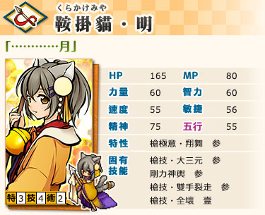 ※「鞍掛貓・明」的數值比以往的槍系式姬來的高,固有特性/技/術也不相同。