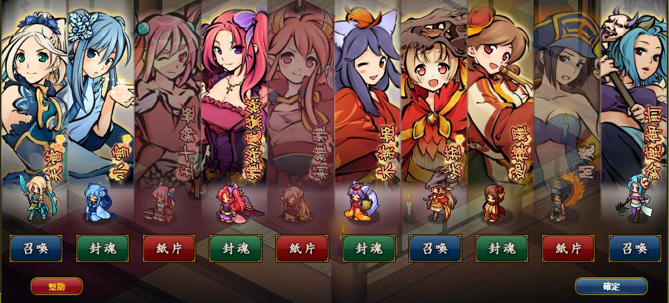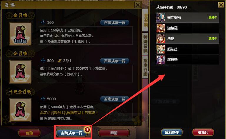 (2) 於召喚出的式姬下方點選「召喚」「符紙」「封魂」的按鈕切換狀態後,再點選確認。