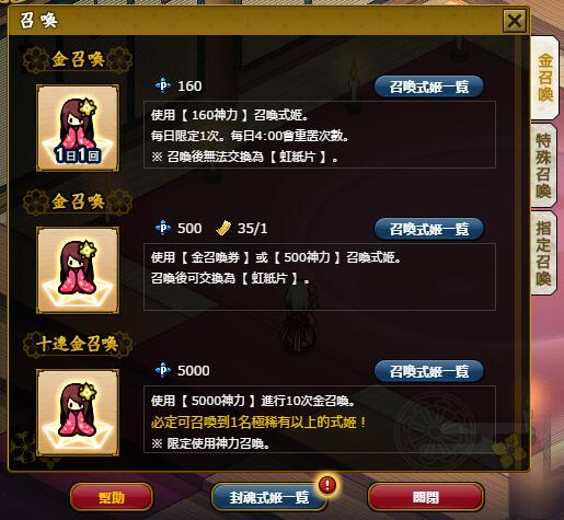 每次的召喚機率都與一般的金召喚相同,但第10次必定可召喚到極稀有及以上的式姬!