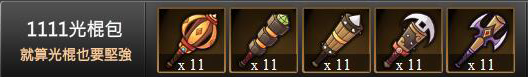 除了本週活躍獎勵限時提升成「金手套設計圖x11、保證書x11」以外,只要於11月11日光棍節當日登入遊戲,即可領取光棍禮包:撼天棒x11、鎮山棒x11、破軍棒x11、七星棒x11、三尖兩刃棒x11!